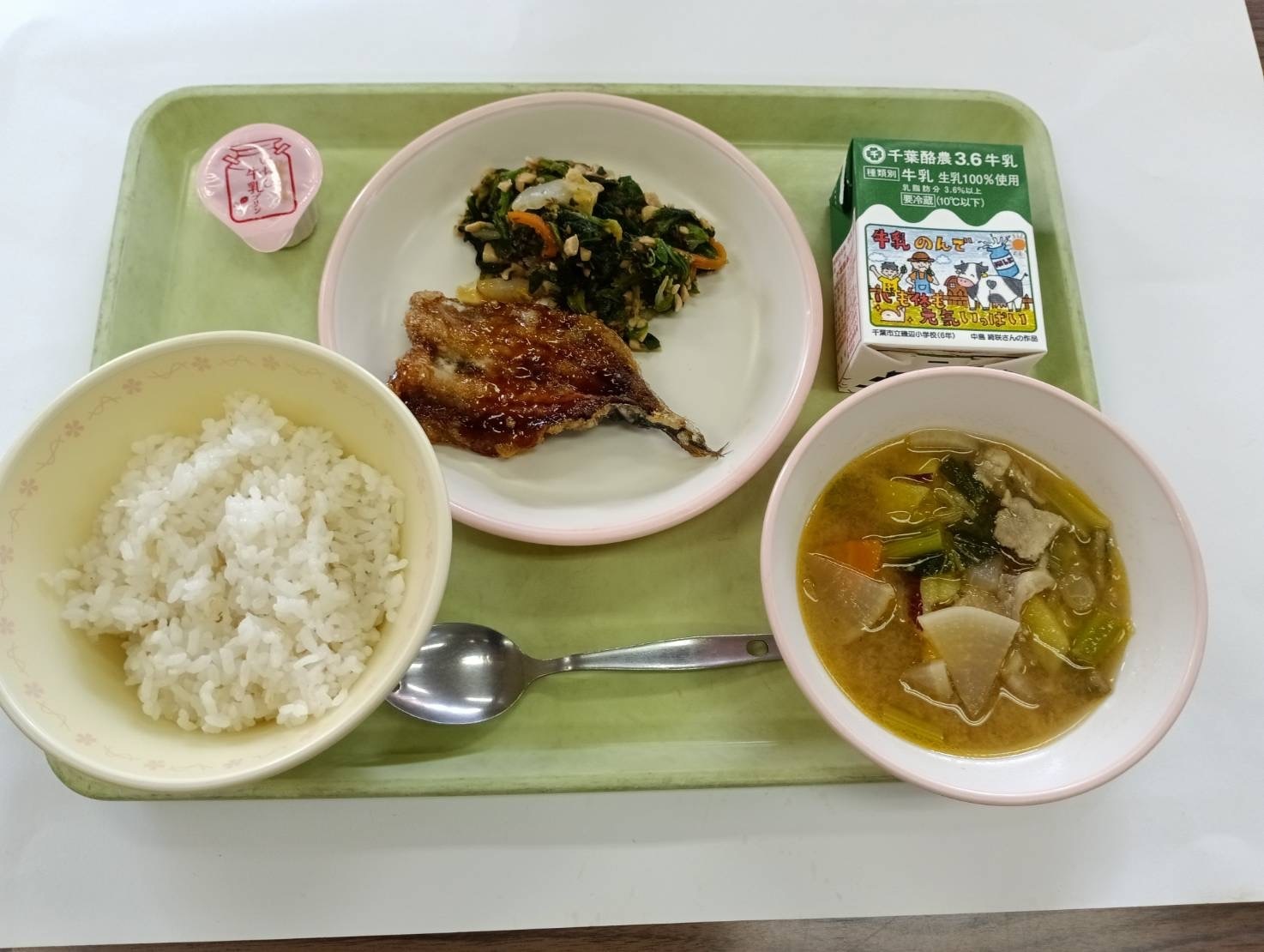 ・麦ごはん ・イワシの蒲焼き ・納豆和え ・さつま汁 ・一口いちご牛乳プリン ・牛乳