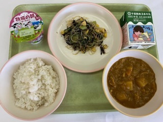 ・麦ごはん ・ポークカレー ・小松菜とひじきのサラダ ・いちごヨーグルト ・牛乳