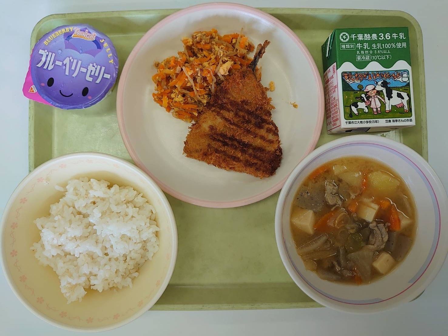 ・麦ごはん ・アジフライ ・にんじんしりしり ・豚汁 ・ブルーベリーゼリー ・牛乳