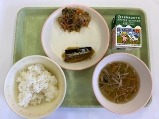 秋はサンマがおいしい季節です。サンマは青魚と呼ばれる種類の魚です。青魚には血液をサラサラにする働きがあり、生活習慣病の予防になる食品と言われています。今日の給食では、今が旬のサンマを生姜煮にしました。
