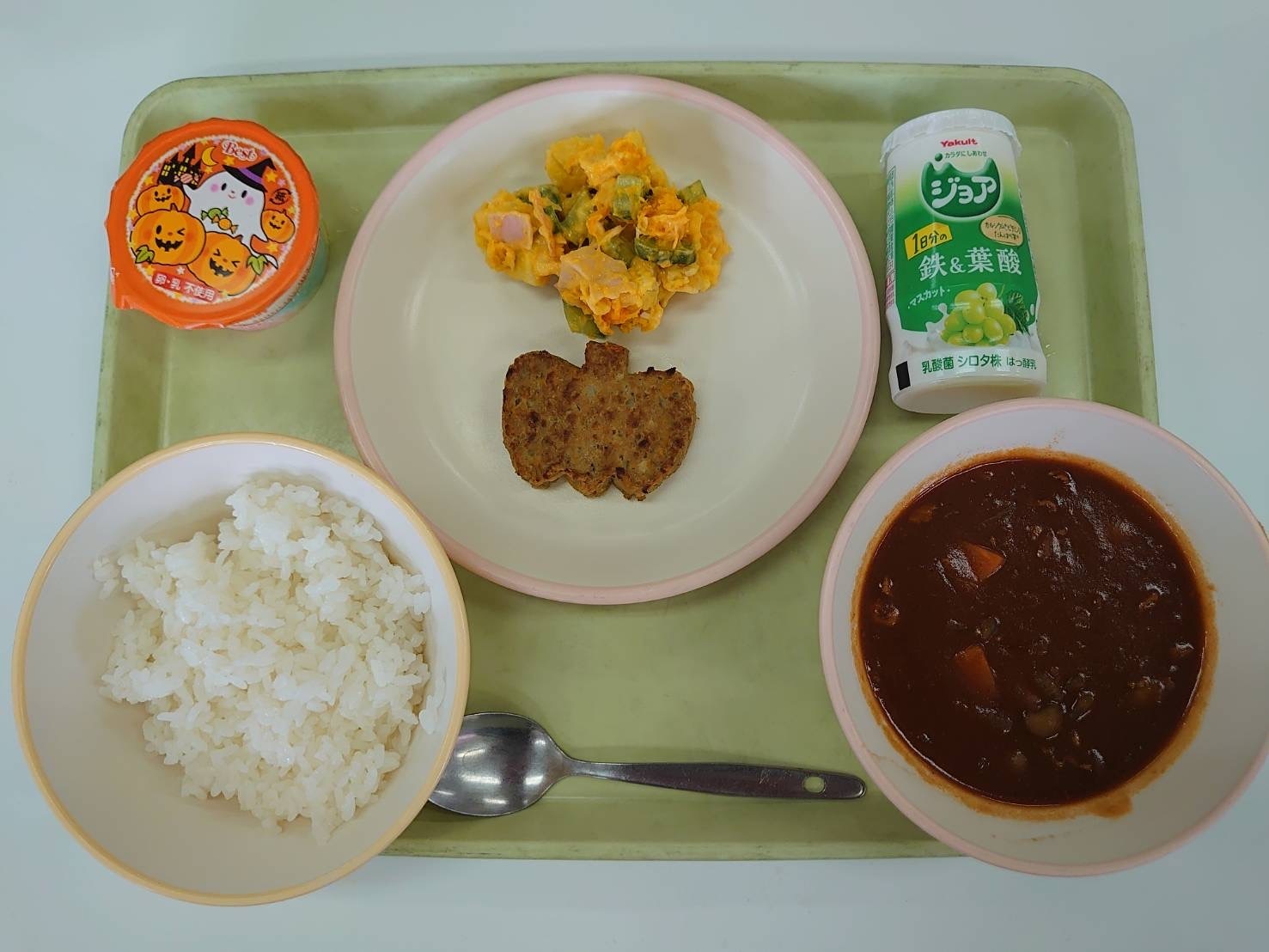 10月31日はハロウィンです。ハロウィンと言えばカボチャですね。今日の給食では、カボチャを使ったサラダとデザートでハロウィン気分を盛り上げています。