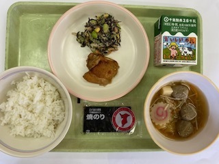 今日の給食は、作田川への環境保全活動を実施している株式会社ユーラスエナジーホールディングス様より地域貢献のためにと、お米とイワシ団子、焼きのりをご提供いただきました。ありがとうございます。みんなでおいしくいただきました。